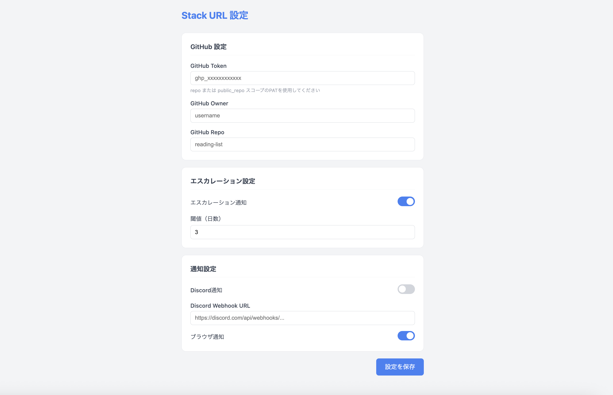 この拡張機能が使うGithubリポジトリとAccess Token, Discord Webhookだけ作成して設定した