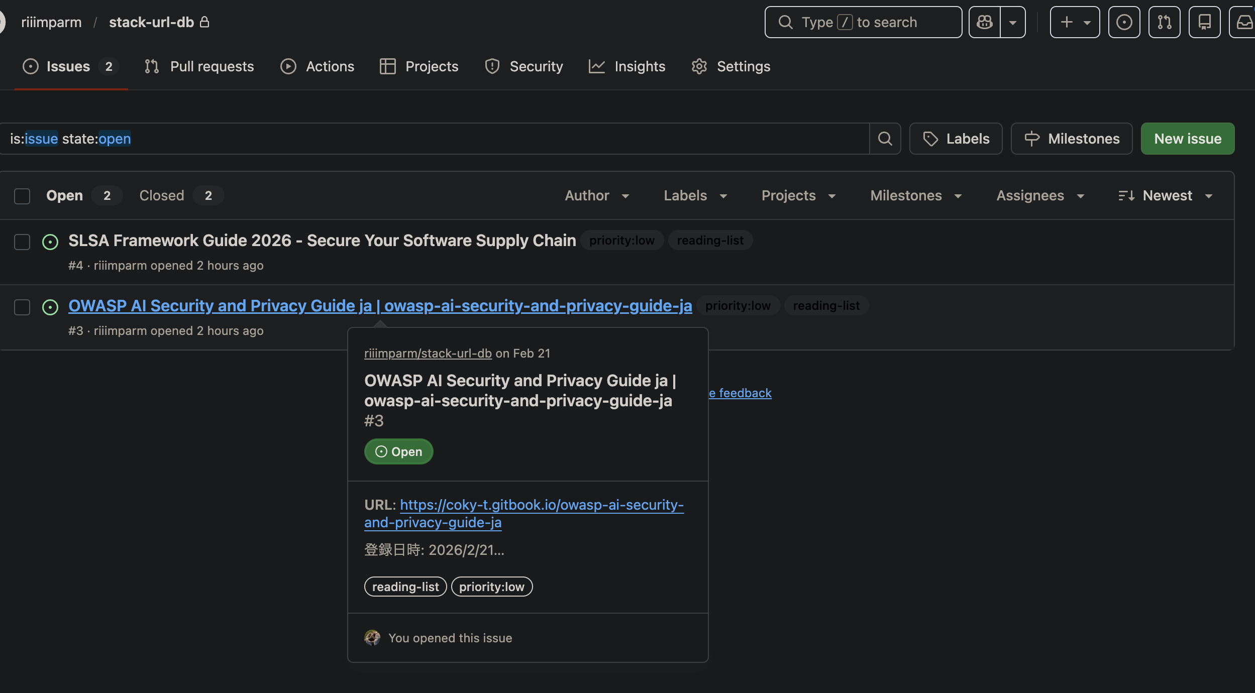 “登録する” ボタンから保存されたサイトもIssueになっている